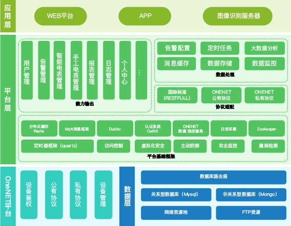 中國(guó)移動(dòng)智能電表云集抄系統(tǒng)架構(gòu)中,各類智能抄表終端內(nèi)置2G/4G/NB-IoT通信模塊,由OneNet提供海量設(shè)備的管理和并發(fā)能力,通過無線網(wǎng)絡(luò)實(shí)現(xiàn)各類場(chǎng)景的智能抄表,通過電量管理平臺(tái)可實(shí)時(shí)監(jiān)測(cè)電量變化,可管理、可追溯。